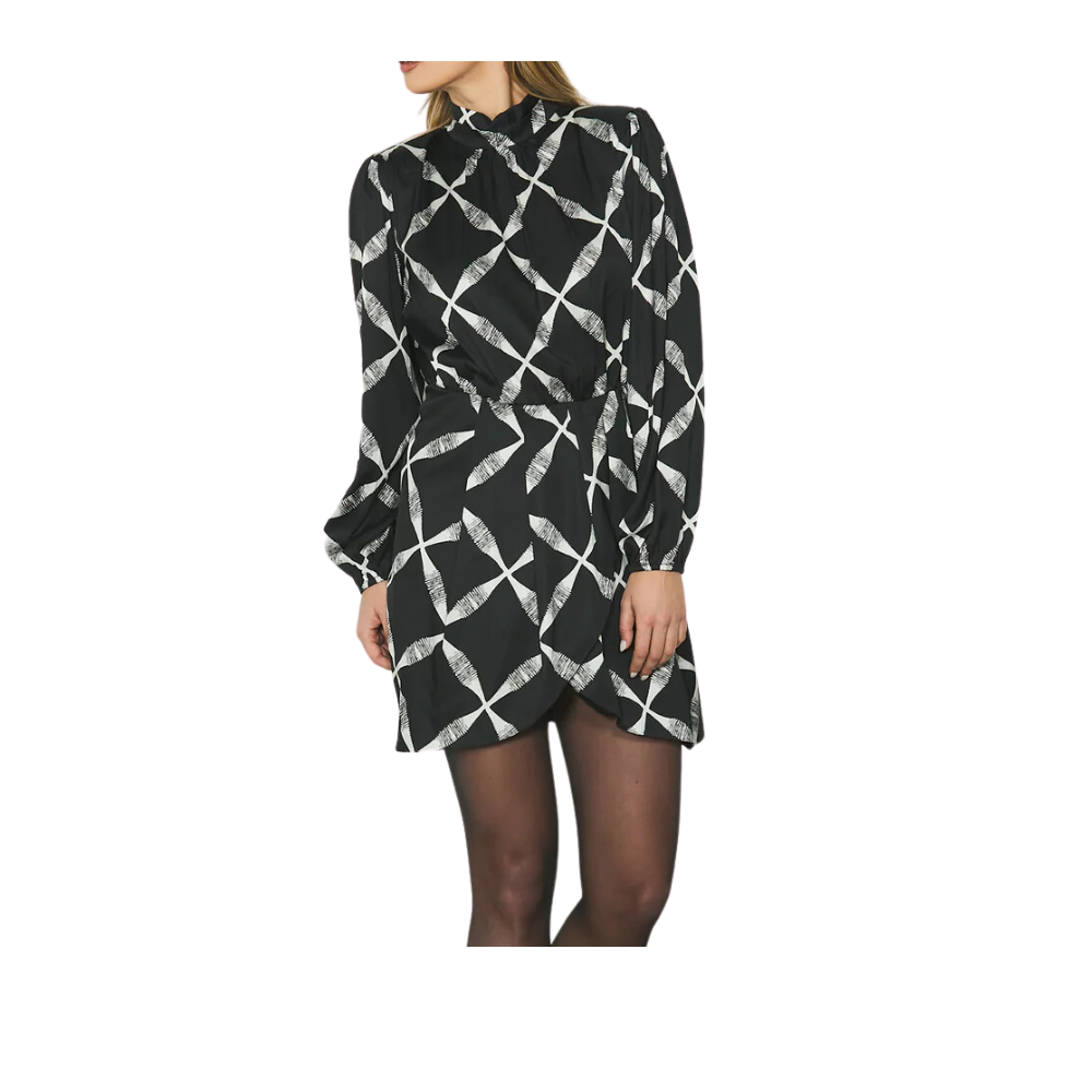 Nuova versione di trama geometrica e ipnotica con ispirazione anni settanta per l’abito GAE corto e innovativo.